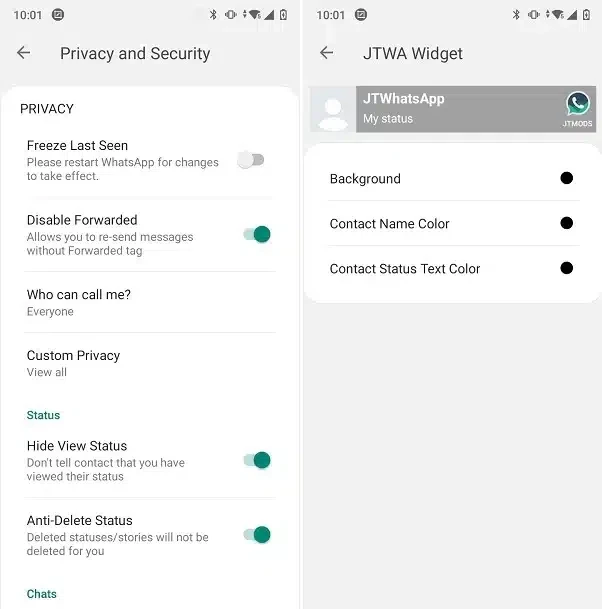 The customization process is unlimited with Whatsapp JT. Here you will find a plethora of amazing and unique features for the purpose i.e. use different themes for your chat screen, several font styles that better match your screen, and change colors, icons, sizes, and such elements as you like.